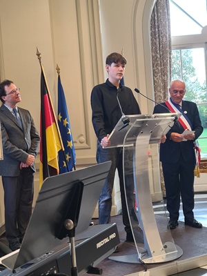 Le public a aussi eu la chance d’entendre Maxime, ancien élève du MLK et aujourd’hui lycéen au LFA. Avec simplicité et sincérité, il a partagé son expérience d’échange Brigitte Sauzay, qui l’a conduit pendant trois mois à Bad Schwalbach lorsqu’il était en 4ème. À travers ses mots, on devinait la richesse de ce séjour : la découverte de la vie quotidienne en Allemagne, l’accueil chaleureux d’une famille, la curiosité éveillée par un autre système scolaire, les balades vers des monuments et villes avoisinantes, sans oublier les spécialités allemandes goûtées avec gourmandise. Et surtout, de belles amitiés et un vrai sentiment d’avoir grandi grâce à cette immersion, sans oublier de grands progrès en allemand.